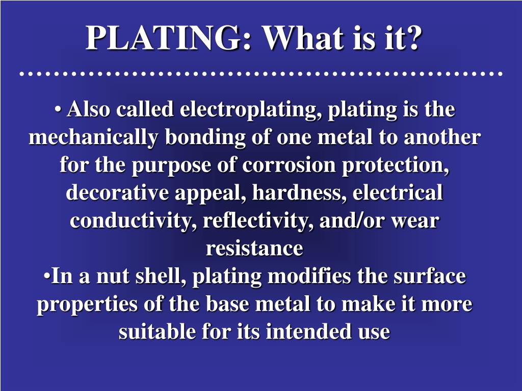 PLATING: What is it? • Also called electroplating, plating is the mechanically bonding of one metal to another for the purpose of corrosion protection, decorative appeal, hardness, electrical conductivity, reflectivity, and/or wear resistance • In a nut shell, plating modifies the surface properties of the base metal to make it more suitable for its intended use