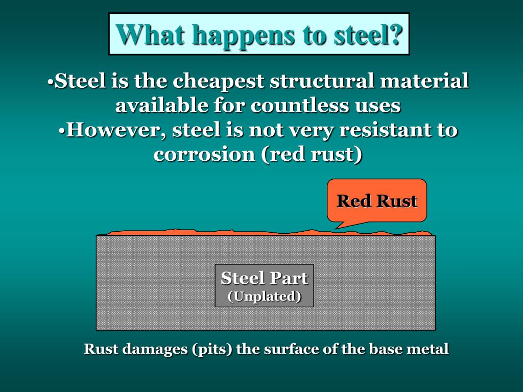 What happens to steel? • Steel is the cheapest structural material available for countless uses • However, steel is not very resistant to corrosion (red rust) Red Rust Steel Part (Unplated) Rust damages (pits) the surface of the base metal