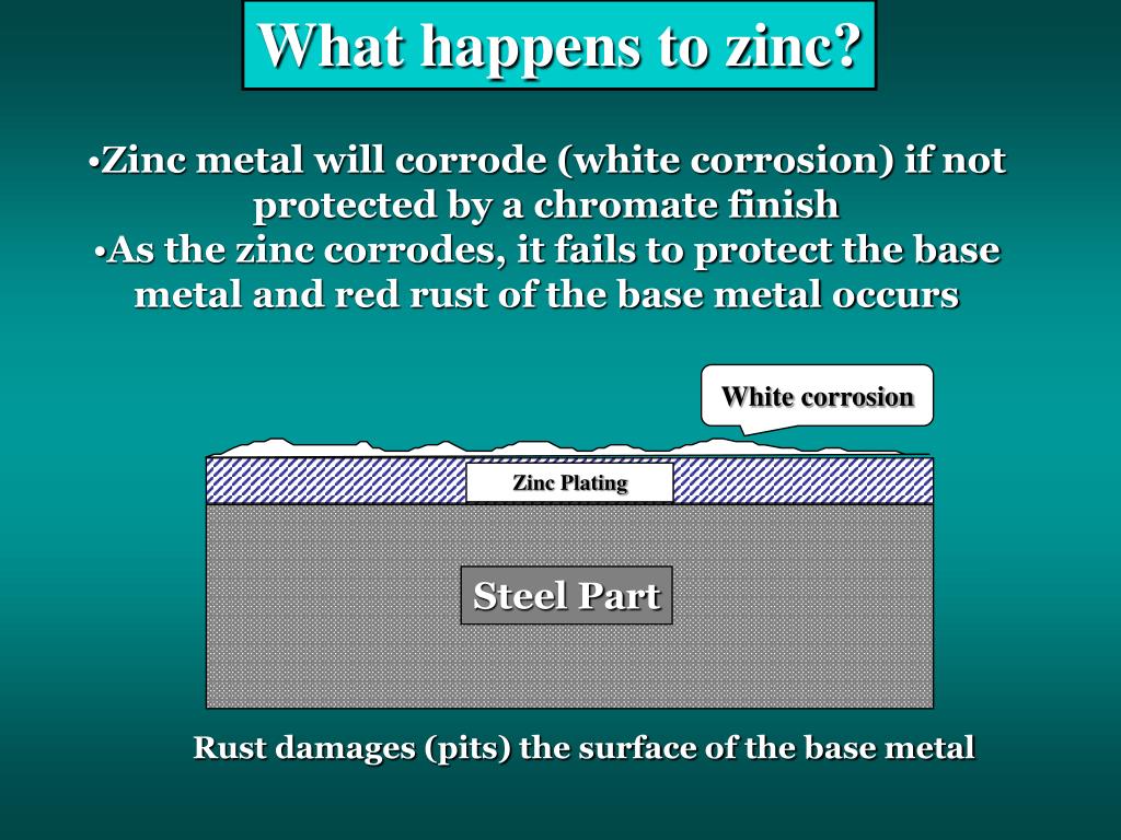 What happens to zinc? • Zinc metal will corrode (white corrosion) if not protected by a chromate finish • As the zinc corrodes, it fails to protect the base metal and red rust of the base metal occurs White corrosion Zinc Plating Steel Part Rust damages (pits) the surface of the base metal