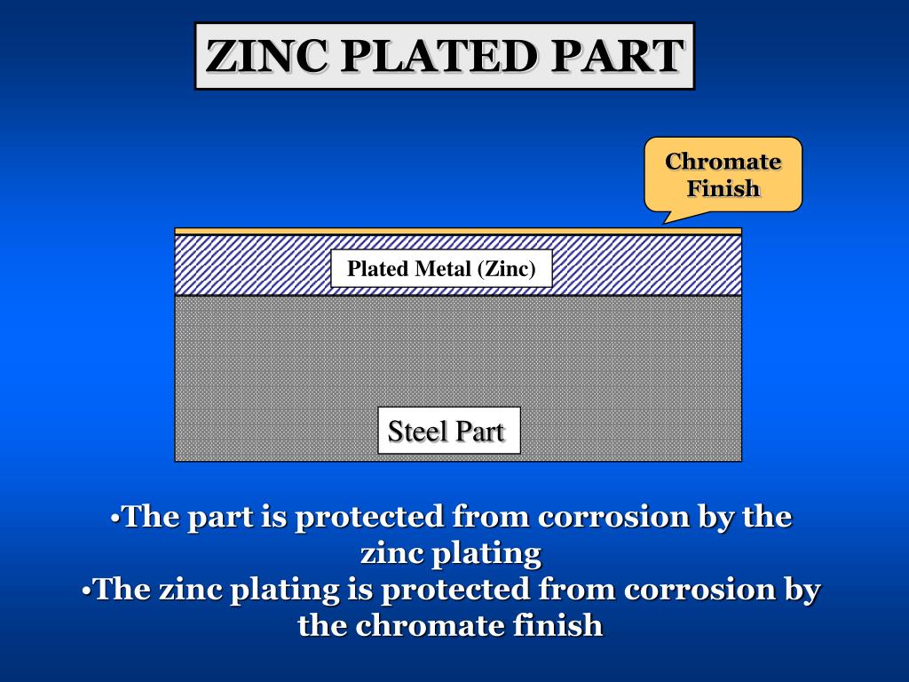 ZINC PLATED PART Chromate Finish Plated Metal (Zinc) Steel Part • The part is protected from corrosion by the zinc plating • The zinc plating is protected from corrosion by the chromate finish