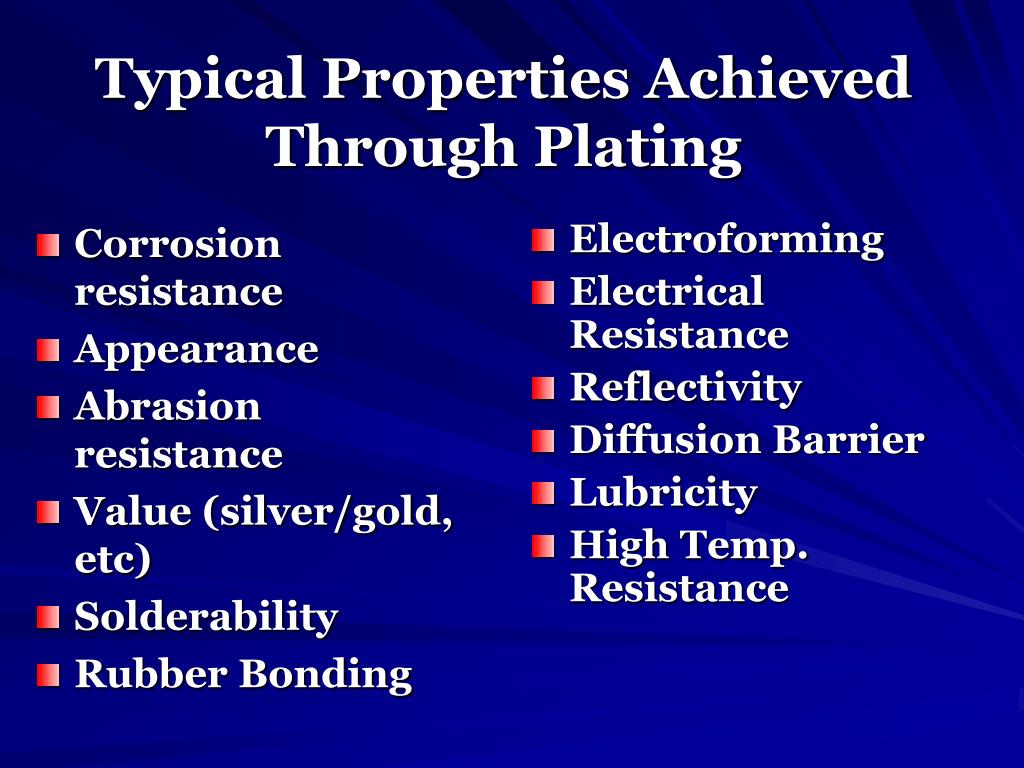 Corrosion resistance Appearance Abrasion resistance Value (silver/gold, etc) Solderability Rubber Bonding Electroforming Electrical Resistance Reflectivity Diffusion Barrier Lubricity High Temp. Resistance Typical Properties AchievedThrough Plating