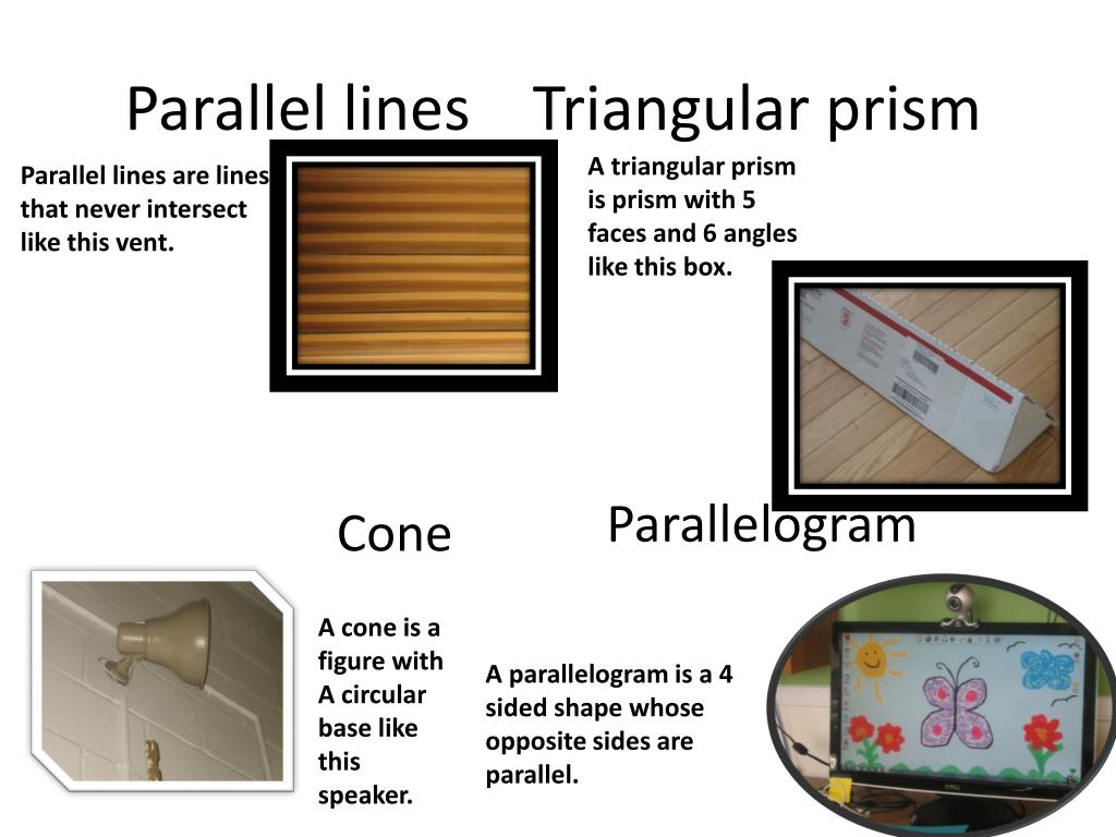 Parallel lines Triangular prism Parallel lines are lines that never intersect like this vent. A triangular prism is prism with 5 faces and 6 angles like this box. Parallelogram Cone A cone is a figure with A circular base like this speaker. A parallelogram is a 4 sided shape whose opposite sides are parallel.
