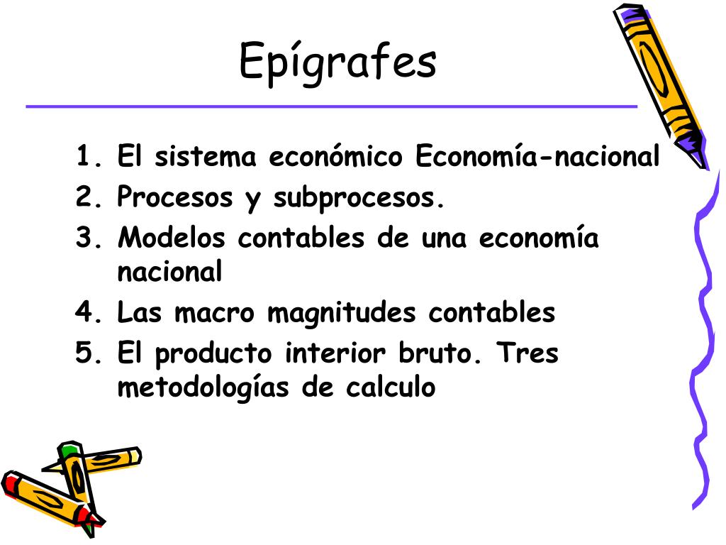 Epígrafes • El sistema económico Economía-nacional • Procesos y subprocesos. • Modelos contables de una economía nacional • Las macro magnitudes contables • El producto interior bruto. Tres metodologías de calculo