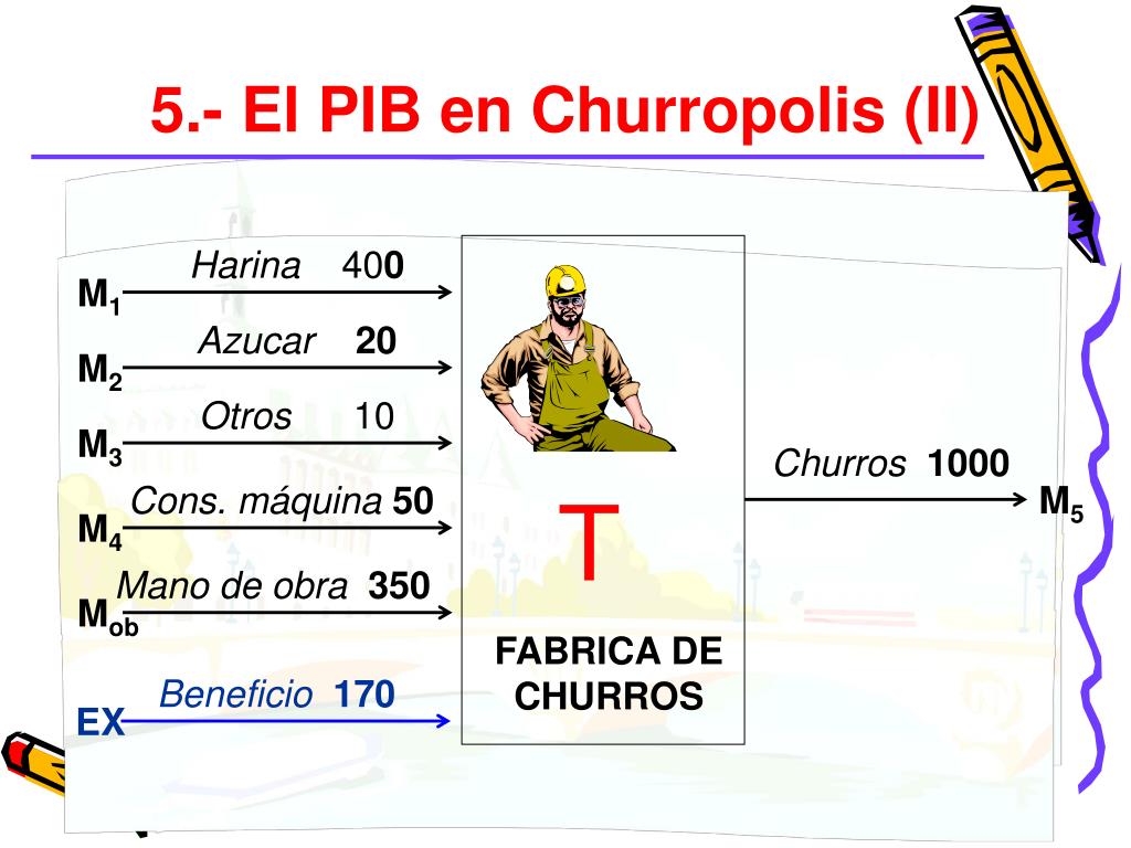 5.- El PIB en Churropolis Vivimos en Churropolis, un país imaginario que se dedica únicamente a fabricar churros, actividad en la que están involucrados todos los ciudadanos del país. Durante el año 2002 ha fabricado churros cuyo valor de mercado asciende a 1.000 u.m. En la fabricación de los churros ha gastado : • Harina 400 • Azúcar 20 • Agua y energía 10 • Consumo de la maquina churrera 50 • Mano de obra en la fabricación de churros. 350