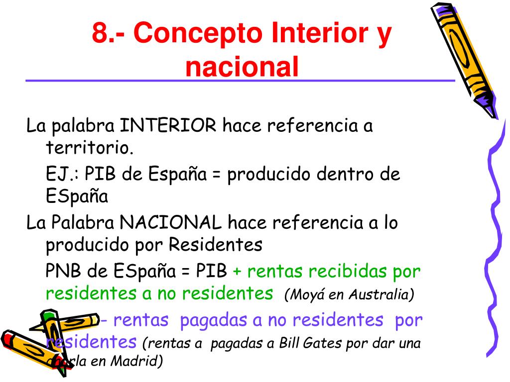 8.- Concepto Interior y nacional La palabra INTERIOR hace referencia a territorio. EJ.: PIB de España = producido dentro de ESpaña La Palabra NACIONAL hace referencia a lo producido por Residentes PNB de ESpaña = PIB + rentas recibidas por residentes a no residentes (Moyá en Australia) - rentas pagadas a no residentes por residentes(rentas a pagadas a Bill Gates por dar una charla en Madrid)