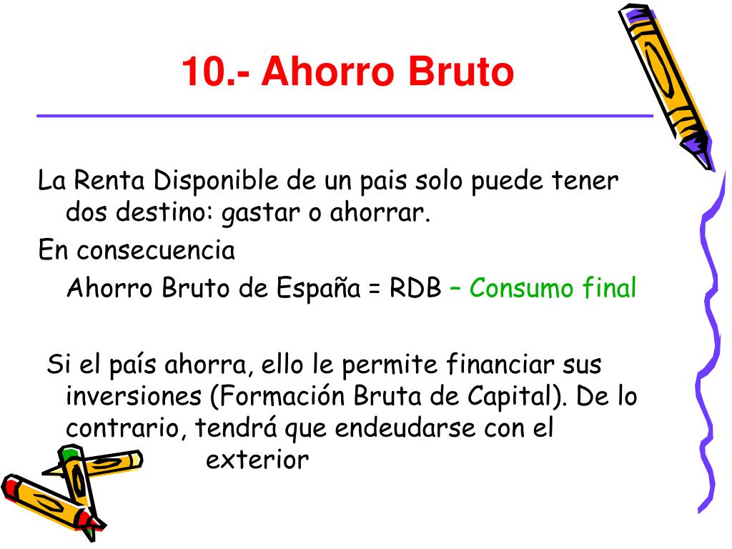 10.- Ahorro Bruto La Renta Disponible de un pais solo puede tener dos destino: gastar o ahorrar. En consecuencia Ahorro Bruto de España = RDB – Consumo final Si el país ahorra, ello le permite financiar sus inversiones (Formación Bruta de Capital). De lo contrario, tendrá que endeudarse con el exterior