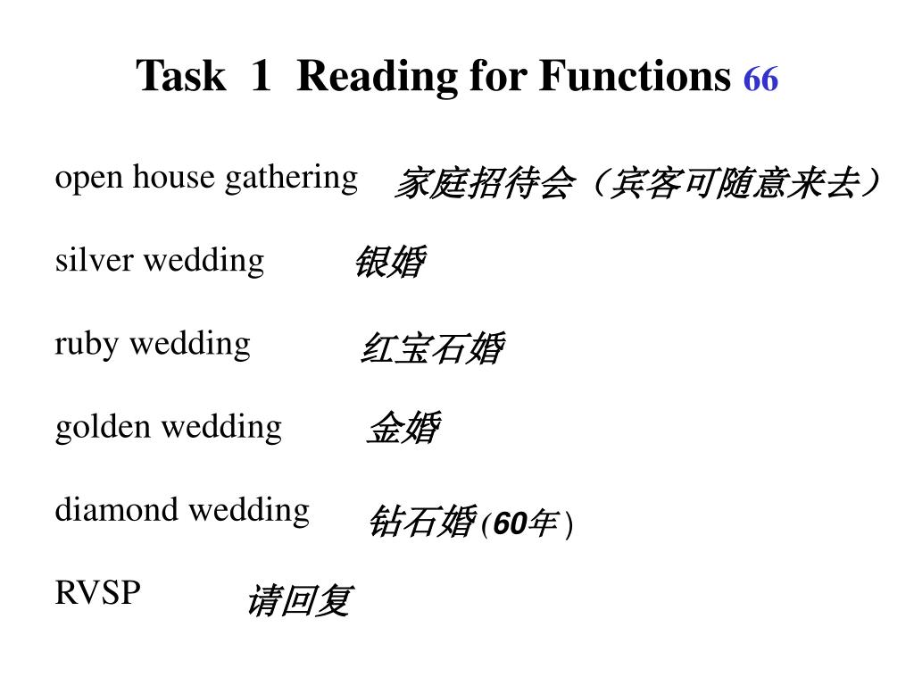 Task 1 Reading for Functions 66 家庭招待会(宾客可随意来去) open house gathering silver wedding ruby wedding golden wedding diamond wedding RVSP 银婚 红宝石婚 金婚 钻石婚 (60年) 请回复