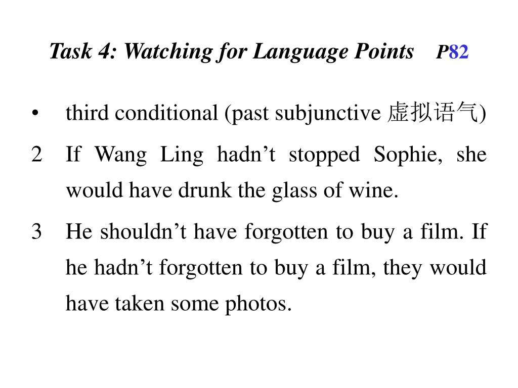 Task 4: Watching for Language PointsP82 • third conditional (past subjunctive 虚拟语气) • If Wang Ling hadn’t stopped Sophie, she would have drunk the glass of wine. • He shouldn’t have forgotten to buy a film. If he hadn’t forgotten to buy a film, they would have taken some photos.