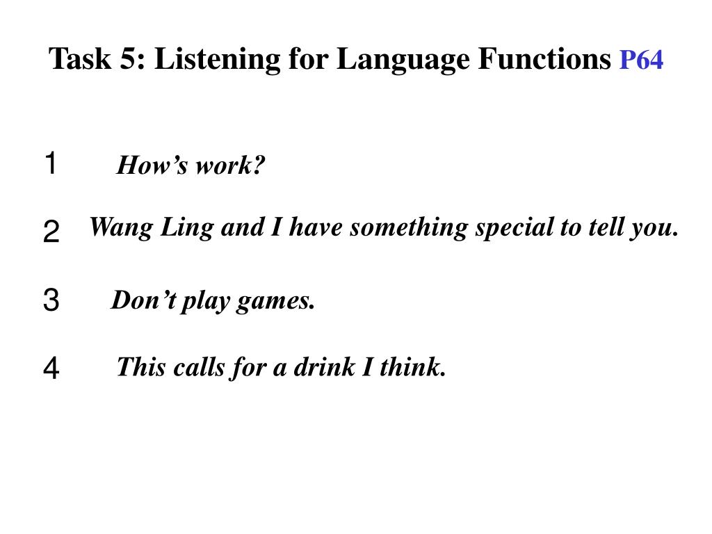 Task 5: Listening for Language Functions P64 1 2 3 4 How’s work? Wang Ling and I have something special to tell you. Don’t play games. This calls for a drink I think.