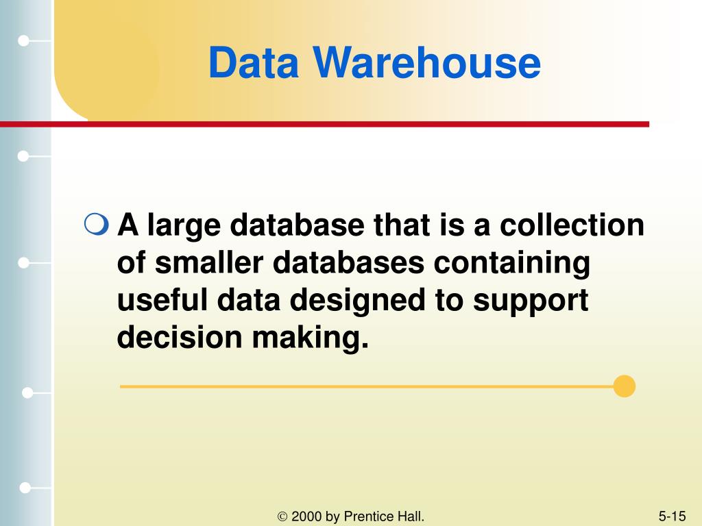 Data Warehouse • A large database that is a collection of smaller databases containing useful data designed to support decision making. 2000 by Prentice Hall.
