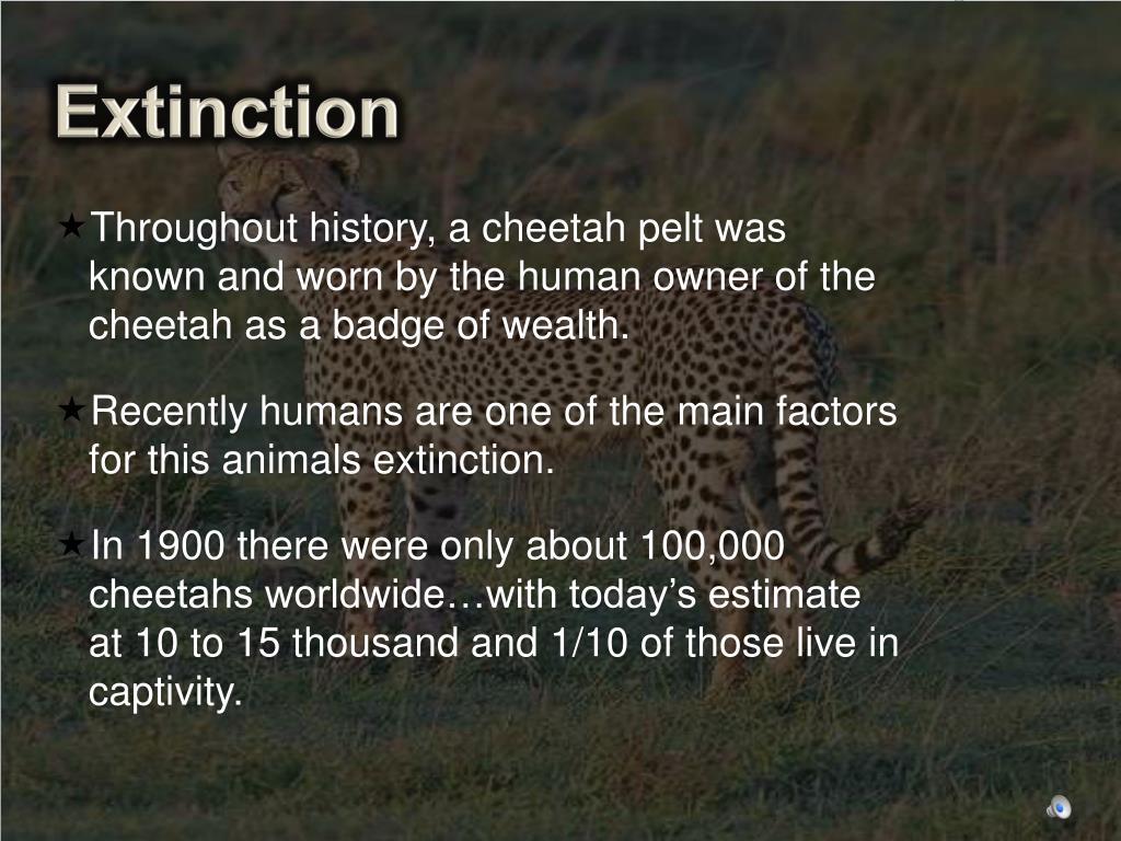 Extinction • Throughout history, a cheetah pelt was known and worn by the human owner of the cheetah as a badge of wealth. • Recently humans are one of the main factors for this animals extinction. • In 1900 there were only about 100,000 cheetahs worldwide…with today’s estimate at 10 to 15 thousand and 1/10 of those live in captivity.