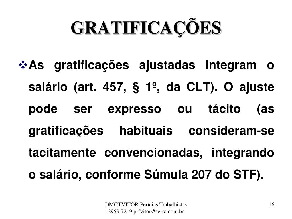 GRATIFICAÇÕES • As gratificações ajustadas integram o salário (art. 457, § 1º, da CLT). O ajuste pode ser expresso ou tácito (as gratificações habituais consideram-se tacitamente convencionadas, integrando o salário, conforme Súmula 207 do STF). DMCTVITOR Perícias Trabalhistas 2959.7219 prfvitor@terra.com.br
