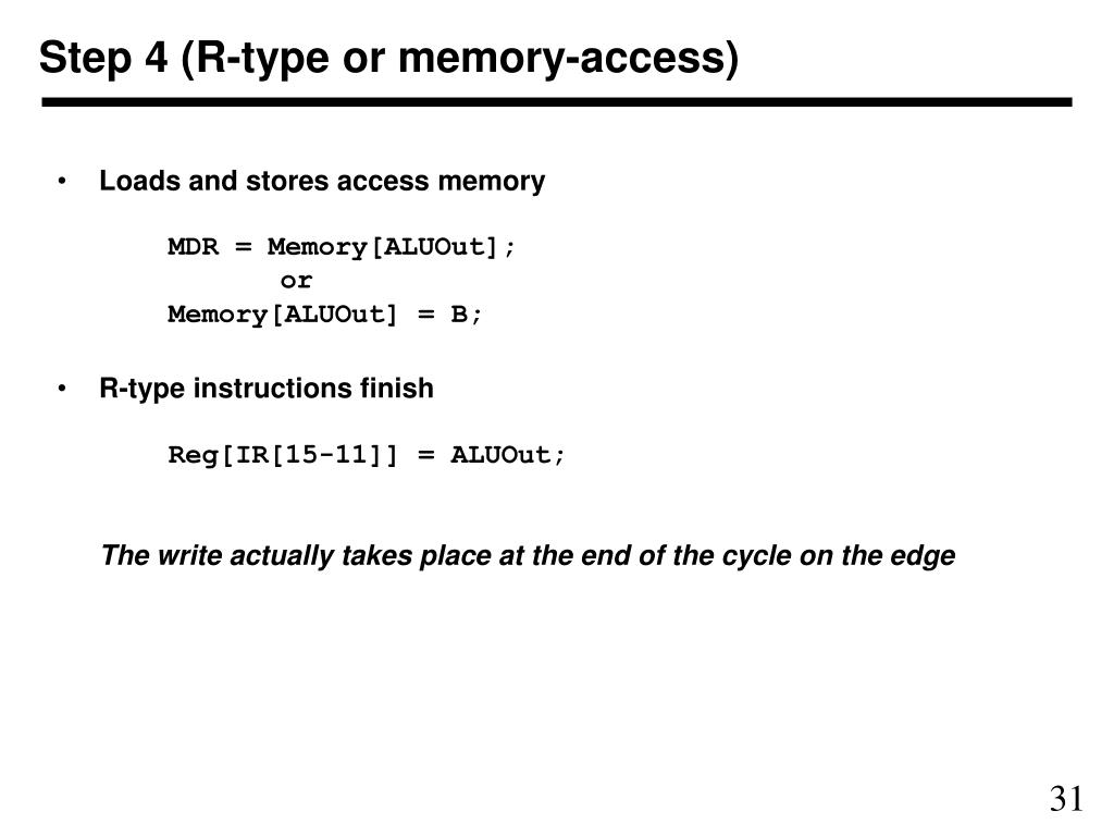 Step 4 (R-type or memory-access) • Loads and stores access memory MDR = Memory[ALUOut]; or Memory[ALUOut] = B; • R-type instructions finish Reg[IR[15-11]] = ALUOut;The write actually takes place at the end of the cycle on the edge