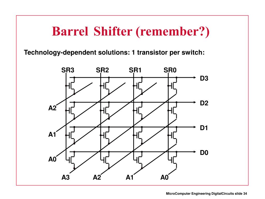 SR3 SR2 SR1 SR0 D3 D2 A2 D1 A1 D0 A0 A3 A2 A1 A0 BarrelShifter (remember?) Technology-dependent solutions: 1 transistor per switch: