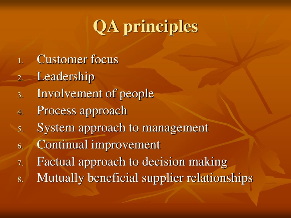 QA principles • Customer focus • Leadership • Involvement of people • Process approach • System approach to management • Continual improvement • Factual approach to decision making • Mutually beneficial supplier relationships