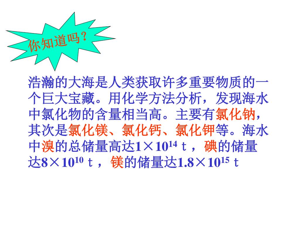 你知道吗? 浩瀚的大海是人类获取许多重要物质的一 个巨大宝藏。用化学方法分析,发现海水 中氯化物的含量相当高。主要有氯化钠, 其次是氯化镁、氯化钙、氯化钾等。海水 中溴的总储量高达1×1014t,碘的储量 达8×1010t,镁的储量达1.8×1015t