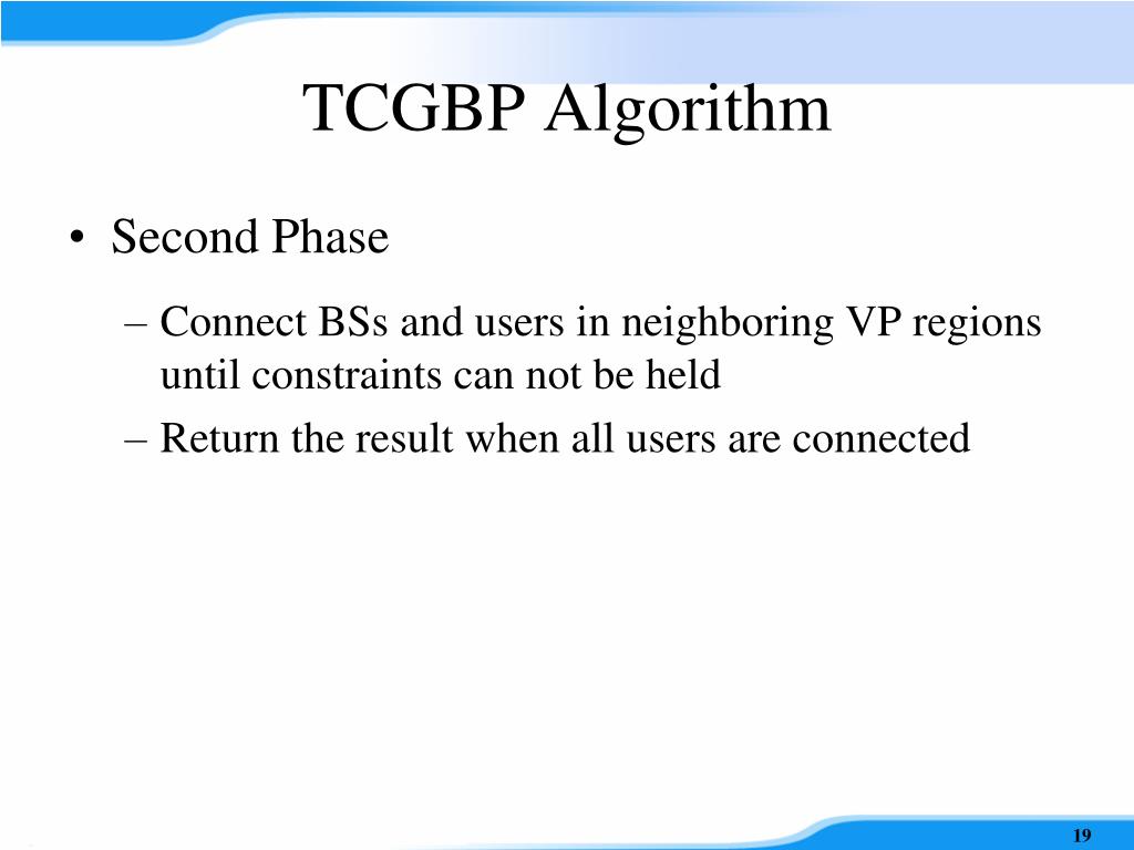 TCGBP Algorithm • Second Phase • Connect BSs and users in neighboring VP regions until constraints can not be held • Return the result when all users are connected
