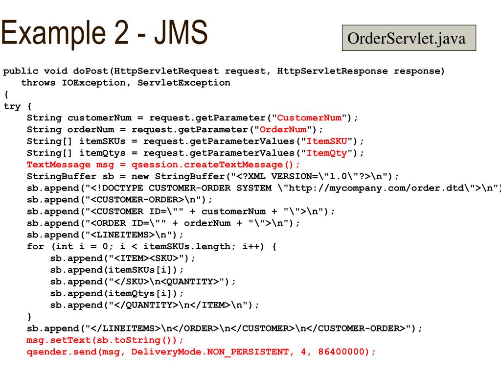 Example 2 - JMS OrderServlet.java public void doPost(HttpServletRequest request, HttpServletResponse response) throws IOException, ServletException { try { String customerNum = request.getParameter("CustomerNum"); String orderNum = request.getParameter("OrderNum"); String[] itemSKUs = request.getParameterValues("ItemSKU"); String[] itemQtys = request.getParameterValues("ItemQty"); TextMessage msg = qsession.createTextMessage(); StringBuffer sb = new StringBuffer("<?XML VERSION=\"1.0\"?>\n"); sb.append("<!DOCTYPE CUSTOMER-ORDER SYSTEM \"http://mycompany.com/order.dtd\">\n"); sb.append("<CUSTOMER-ORDER>\n"); sb.append("<CUSTOMER ID=\"" + customerNum + "\">\n"); sb.append("<ORDER ID=\"" + orderNum + "\">\n"); sb.append("<LINEITEMS>\n"); for (int i = 0; i < itemSKUs.length; i++) { sb.append("<ITEM><SKU>"); sb.append(itemSKUs[i]); sb.append("</SKU>\n<QUANTITY>"); sb.append(itemQtys[i]); sb.append("</QUANTITY>\n</ITEM>\n"); } sb.append("</LINEITEMS>\n</ORDER>\n</CUSTOMER>\n</CUSTOMER-ORDER>"); msg.setText(sb.toString()); qsender.send(msg, DeliveryMode.NON_PERSISTENT, 4, 86400000);