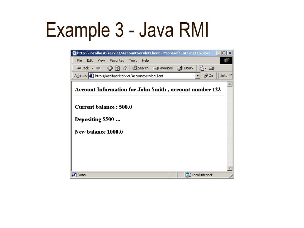 Example 3 - Java RMI AccountServletClient.java public void doGet (HttpServletRequest req, HttpServletResponse res) throws IOException { try { PrintWriter out = res.getWriter(); res.setContentType("text/html"); out.println("<HTML><HEAD><H3>Account Information for "); out.println(myAccount.getName()); out.println(", account number "); out.println(myAccount.getId()); out.println("<HR></HEAD><BODY>"); out.println("<H3>Current balance : " ); out.println(myAccount.getBalance()); out.println("</H3><P><H3>Depositing $500 ... </H3></P>"); myAccount.deposit(500); out.println("<P><H3>New balance"); out.println(myAccount.getBalance()); out.println("</H3></P></BODY></HTML>"); } catch(Exception e) { System.err.println("Error in AccountClient "+e); } } }