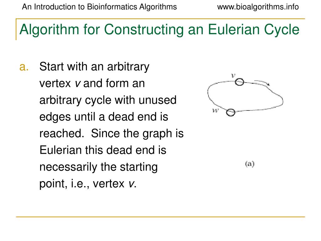 Algorithm for Constructing an Eulerian Cycle • Start with an arbitrary vertex v and form an arbitrary cycle with unused edges until a dead end is reached. Since the graph is Eulerian this dead end is necessarily the starting point, i.e., vertex v.