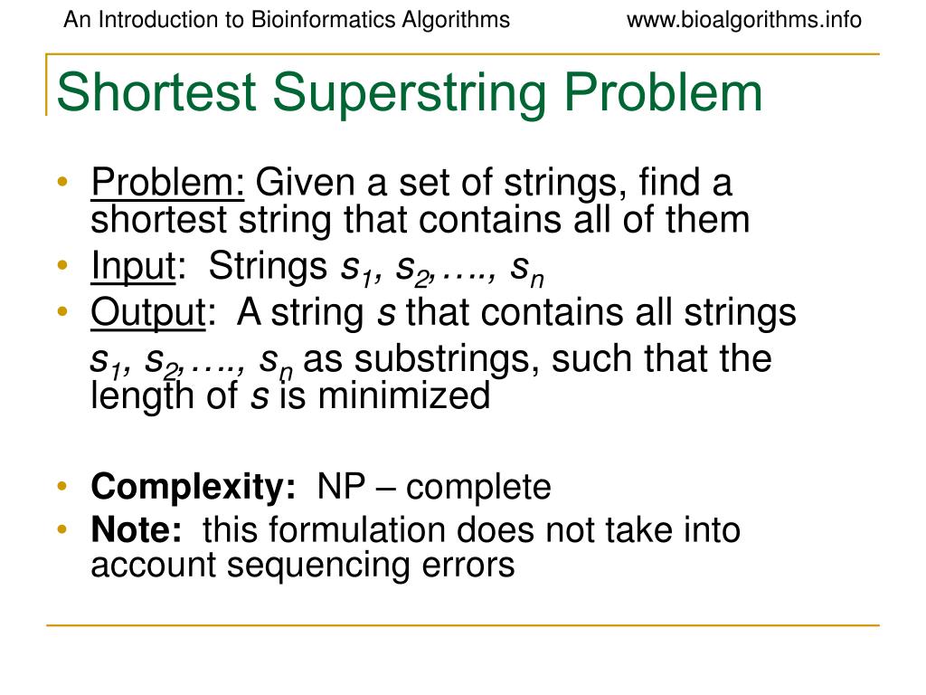 Shortest Superstring Problem • Problem: Given a set of strings, find a shortest string that contains all of them • Input: Strings s1, s2,…., sn • Output: A string s that contains all strings s1, s2,…., sn as substrings, such that the length of s is minimized • Complexity: NP – complete • Note: this formulation does not take into account sequencing errors