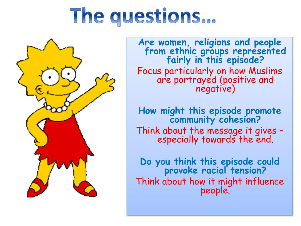Are women, religions and people from ethnic groups represented fairly in this episode? Focus particularly on how Muslims are portrayed (positive and negative) Yes – There are different religions represented – e.g. Hindu-Apu, Buddhist-Lisa, Christian-Flanders, Muslim-new family, Jewish-Krusty. Yes – The new Muslim family are shown to be welcoming and neighbourly – e.g. Offer Bart dinner upon first meeting him. No – It shows a stereotypical view of Muslims and Non-Muslims E.g. Homer assuming they are terrorists.