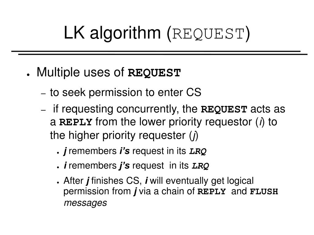 LK algorithm (REQUEST) • Multiple uses of REQUEST • to seek permission to enter CS • if requesting concurrently, the REQUEST acts as a REPLY from the lower priority requestor (i) to the higher priority requester (j) • j remembers i’s request in itsLRQ • i remembers j’s request in itsLRQ • After j finishes CS, i will eventually get logical permission from j via a chain ofREPLYandFLUSH messages