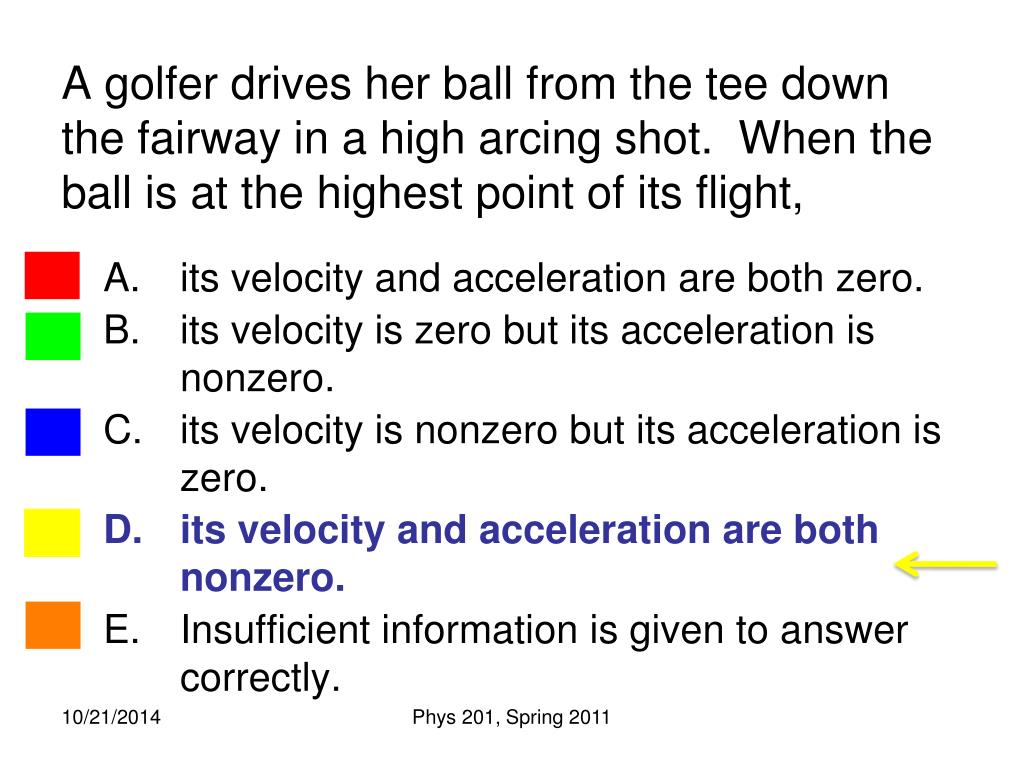 A golfer drives her ball from the tee down the fairway in a high arcing shot. When the ball is at the highest point of its flight, • its velocity and acceleration are both zero. • its velocity is zero but its acceleration is nonzero. • its velocity is nonzero but its acceleration is zero. • its velocity and acceleration are both nonzero. • Insufficient information is given to answer correctly. Phys 201, Spring 2011