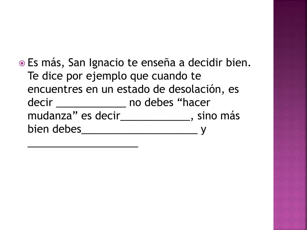 Es más, San Ignacio te enseña a decidir bien. Te dice por ejemplo que cuando te encuentres en un estado de desolación, es decir ____________ no debes “hacer mudanza” es decir____________, sino más bien debes____________________ y ___________________