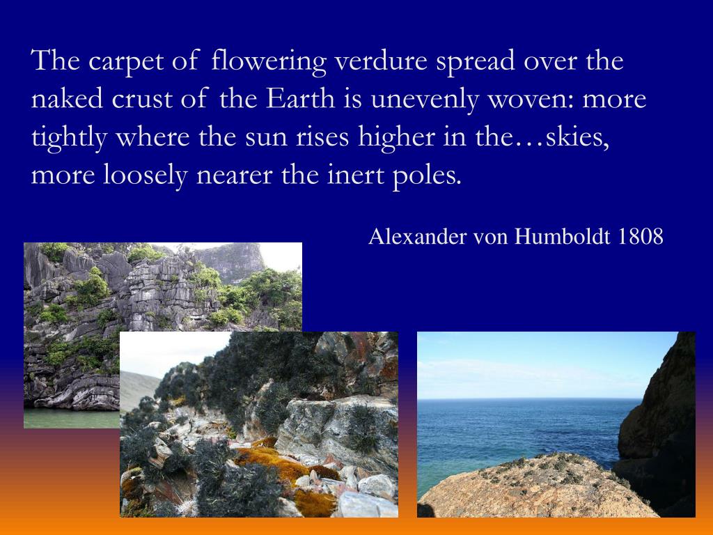 The carpet of flowering verdure spread over the naked crust of the Earth is unevenly woven: more tightly where the sun rises higher in the…skies, more loosely nearer the inert poles. Alexander von Humboldt 1808