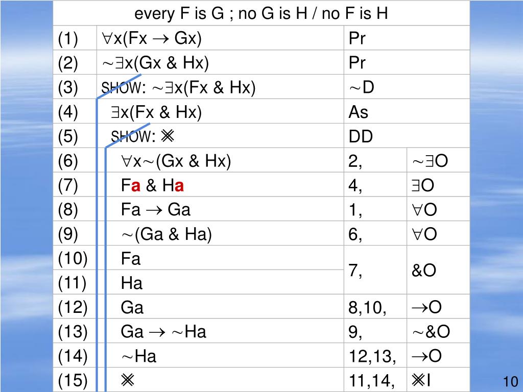 Example 1 (repeated) every F is G ; no G is H / no F is H (1) x(Fx Gx) Pr (2) x(Gx & Hx) Pr (3) : x(Fx & Hx) D (4) x(Fx & Hx) As (5) : DD (6) x(Gx & Hx) 2, O (7) Fa & Ha 4, O (8) Fa Ga 1, O (9) (Ga & Ha) 6, O (10) Fa 7, &O (11) Ha (12) Ga 8,10, O (13) Ga Ha 9, &O (14) Ha 12,13, O (15) 11,14, I