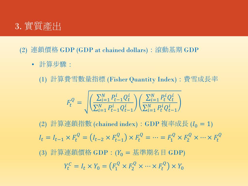 3. 實質產出 (2) 連鎖價格 GDP (GDP at chained dollars):滾動基期 GDP 計算步驟: (1) 計算費雪數量指標 (Fisher Quantity Index):費雪成長率 計算連鎖指數 (chained index):GDP 複率成長 () (3) 計算連鎖價格 GDP:(名目 GDP)