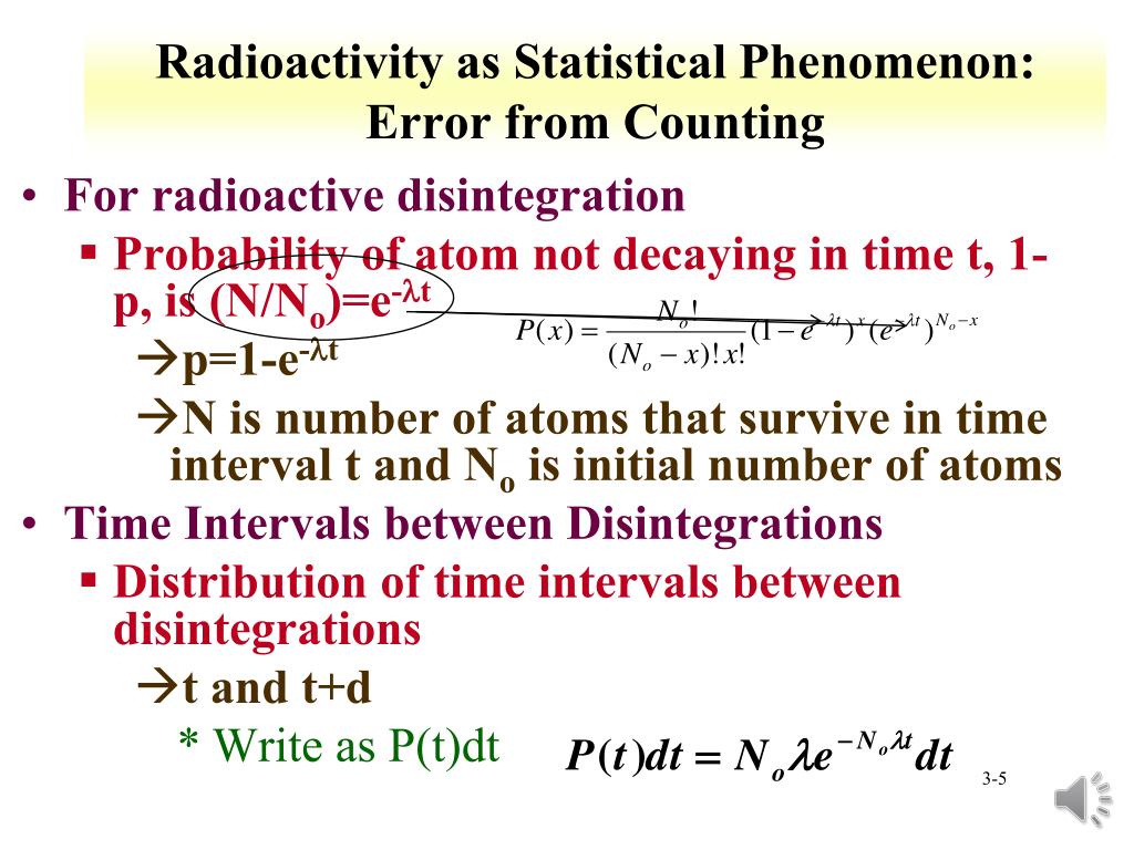 Radioactivity as Statistical Phenomenon: Error from Counting • For radioactive disintegration • Probability of atom not decaying in time t, 1-p, is (N/No)=e-t • p=1-e-t • N is number of atoms that survive in time interval t and No is initial number of atoms • Time Intervals between Disintegrations • Distribution of time intervals between disintegrations • t and t+d • Write as P(t)dt