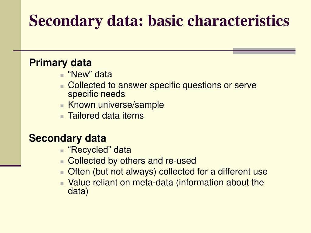 Secondary data: basic characteristics Primary data • “New” data • Collected to answer specific questions or serve specific needs • Known universe/sample • Tailored data items Secondary data • “Recycled” data • Collected by others and re-used • Often (but not always) collected for a different use • Value reliant on meta-data (information about the data)