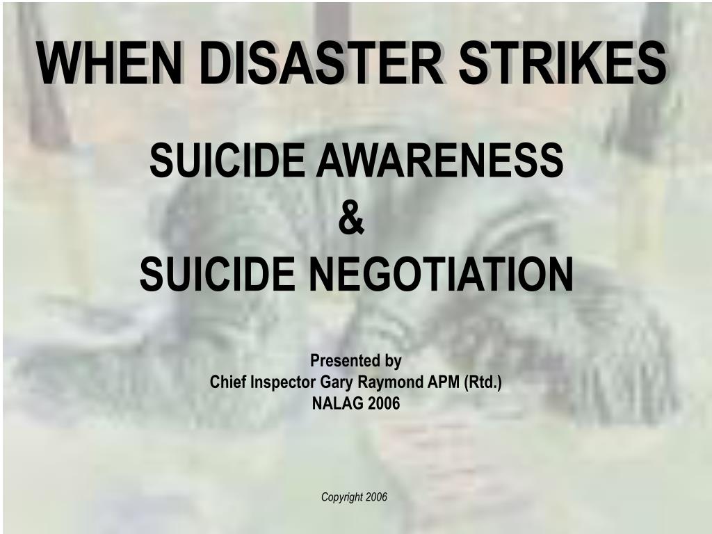 WHEN DISASTER STRIKES SUICIDE AWARENESS & SUICIDE NEGOTIATION Presented by Chief Inspector Gary Raymond APM (Rtd.) NALAG 2006 Copyright 2006