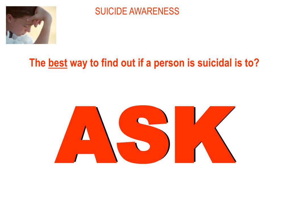 SUICIDE AWARENESS The best way to find out if a person is suicidal is to? ASK