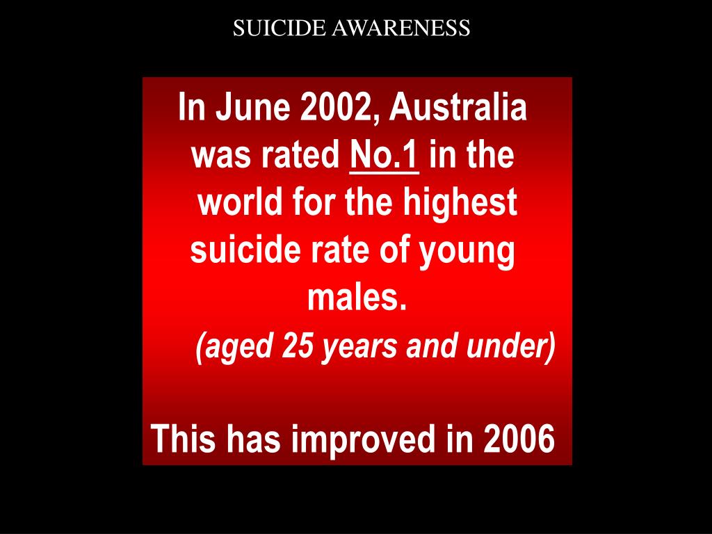 SUICIDE AWARENESS In June 2002, Australia was rated No.1 in the world for the highest suicide rate of young males. (aged 25 years and under) This has improved in 2006