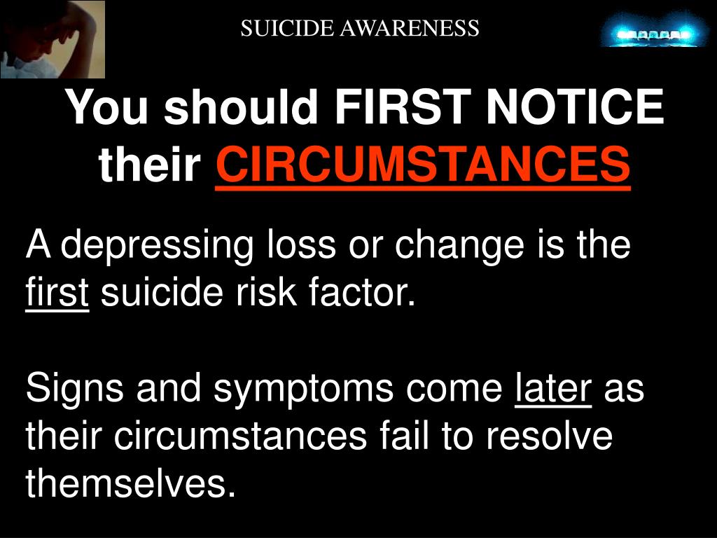 SUICIDE AWARENESS You should FIRST NOTICE their CIRCUMSTANCES A depressing loss or change is the first suicide risk factor. Signs and symptoms come later as their circumstances fail to resolve themselves.