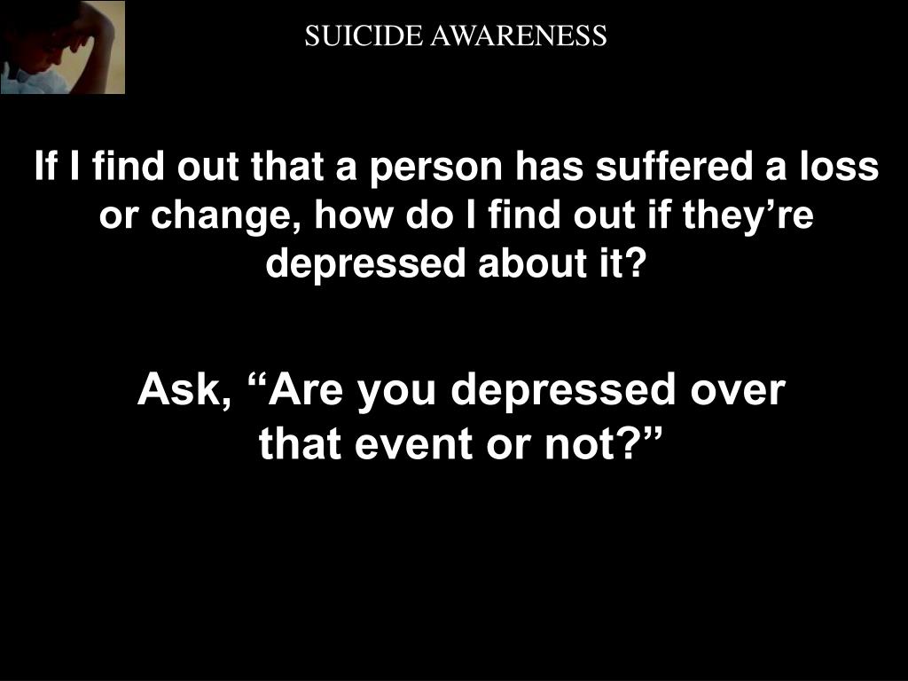 SUICIDE AWARENESS If I find out that a person has suffered a loss or change, how do I find out if they’re depressed about it? Ask, “Are you depressed over that event or not?”