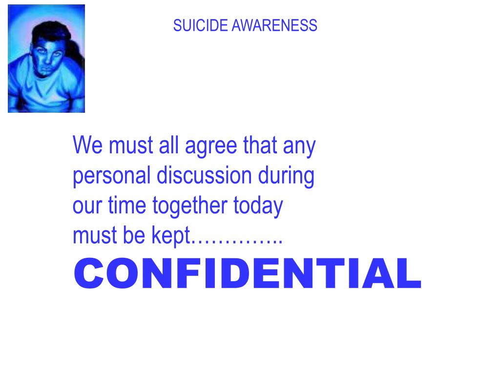 SUICIDE AWARENESS We must all agree that any personal discussion during our time together today must be kept………….. CONFIDENTIAL