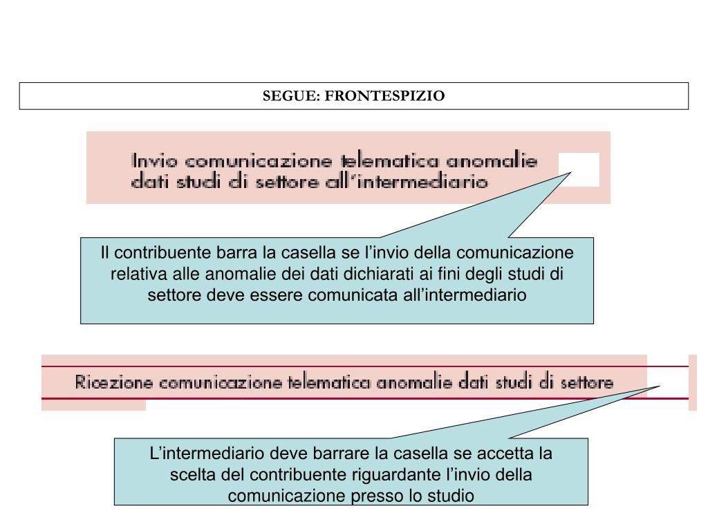 SEGUE: FRONTESPIZIO Il contribuente barra la casella se l’invio della comunicazione relativa alle anomalie dei dati dichiarati ai fini degli studi di settore deve essere comunicata all’intermediario L’intermediario deve barrare la casella se accetta la scelta del contribuente riguardante l’invio della comunicazione presso lo studio