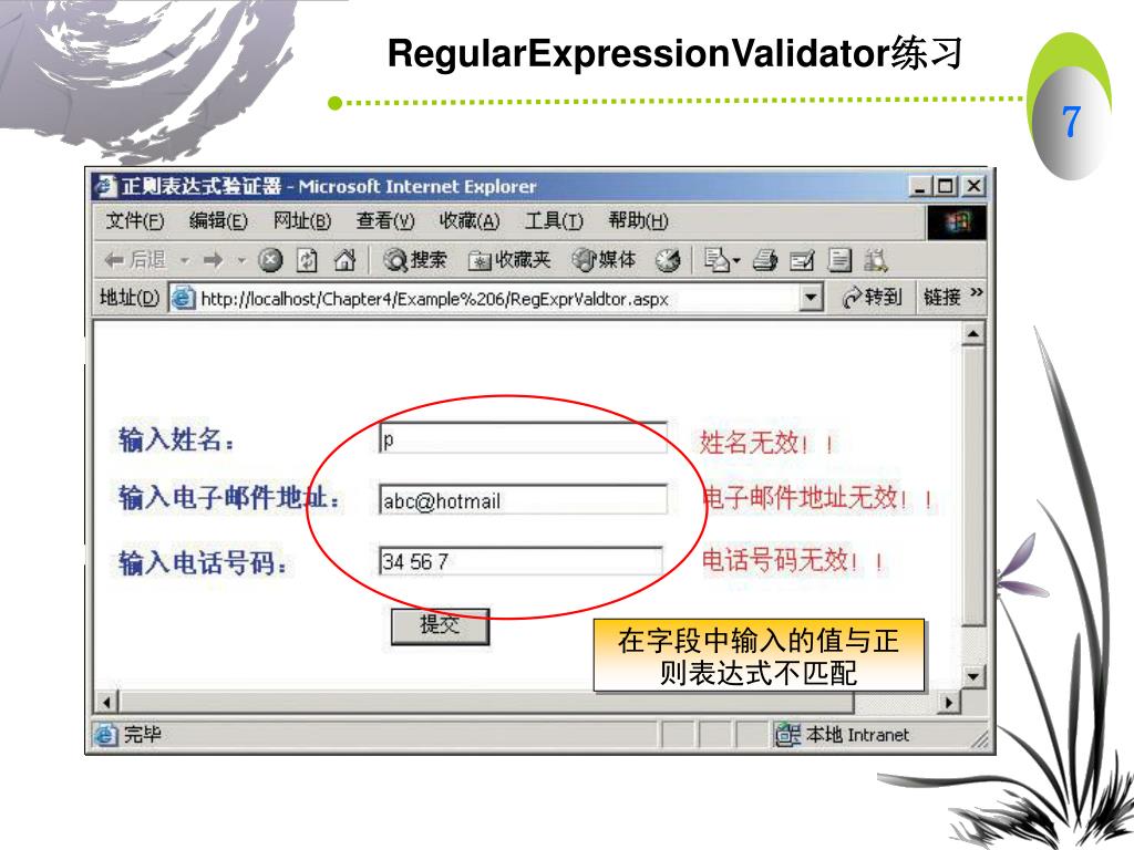 RegularExpressionValidator练习 7 用来验证姓名的控件的验证表达式的值: \w{2-50} 用来验证电子邮件的控件的验证表达式的值: \w+([-+.]\w+)*@\w+([-.]\w+)*\.\w+([-.]\w+)* 用来验证电话号码的控件的验证表达式的值: [0-9]{11} 在字段中输入的值与正则表达式不匹配