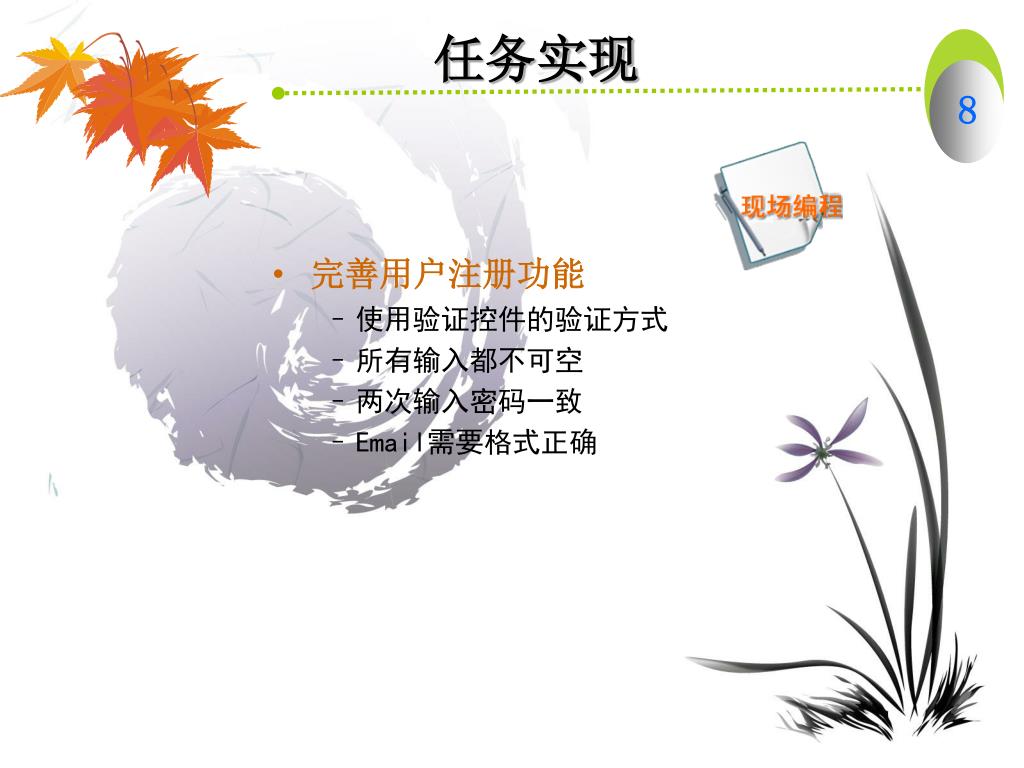 任务实现 8 • 完善用户注册功能 • 使用验证控件的验证方式 • 所有输入都不可空 • 两次输入密码一致 • Email需要格式正确