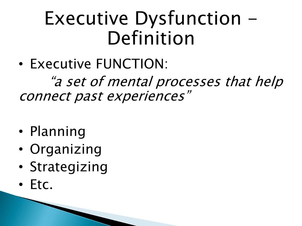 Executive Dysfunction - Definition • Executive FUNCTION: “a set of mental processes that help connect past experiences” • Planning • Organizing • Strategizing • Etc.