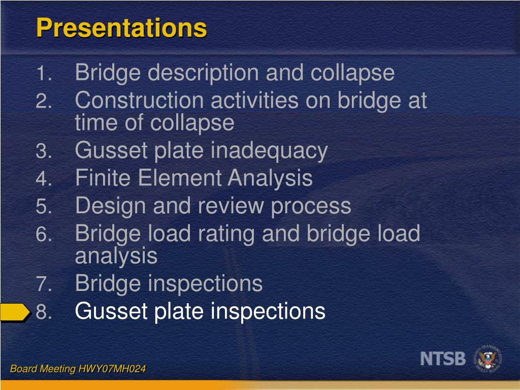 Presentations • Bridge description and collapse • Construction activities on bridge at time of collapse • Gusset plate inadequacy • Finite Element Analysis • Design and review process • Bridge load rating and bridge load analysis • Bridge inspections • Gusset plate inspections