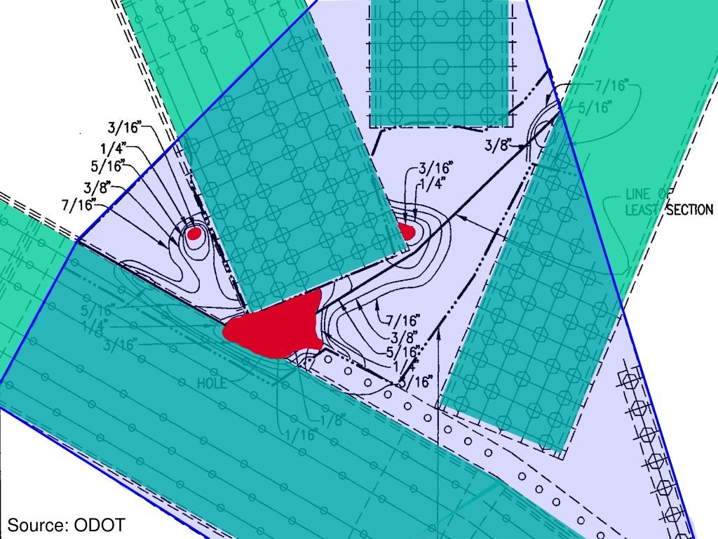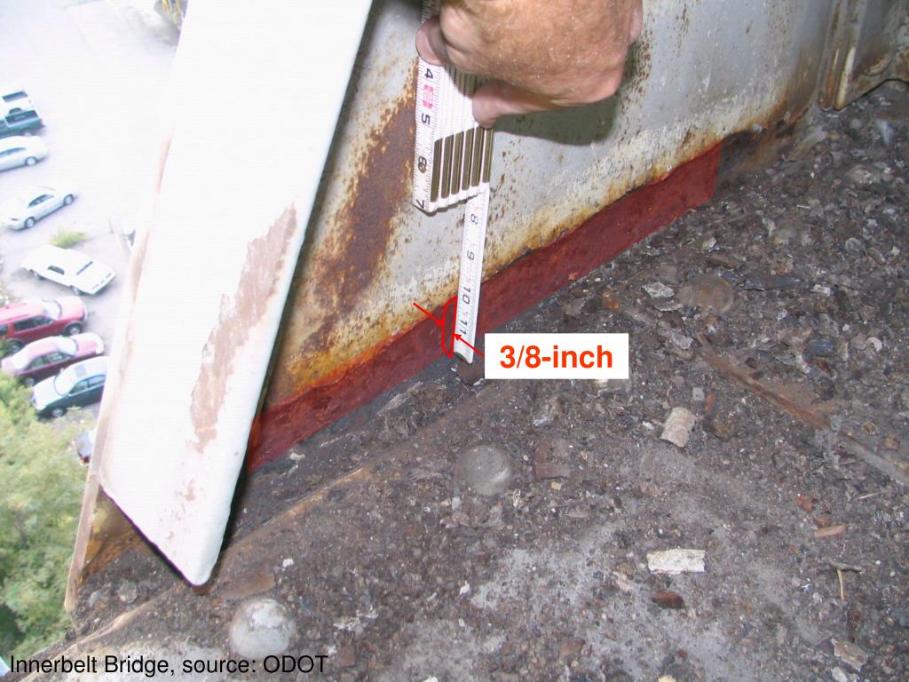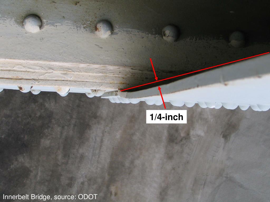 Corrosion on Ohio Bridges • Gusset plate corrosion on Innerbelt bridge reported during October 2007 inspection • Follow-up evaluation used NDE methods • Original visual inspections grossly underestimated section loss