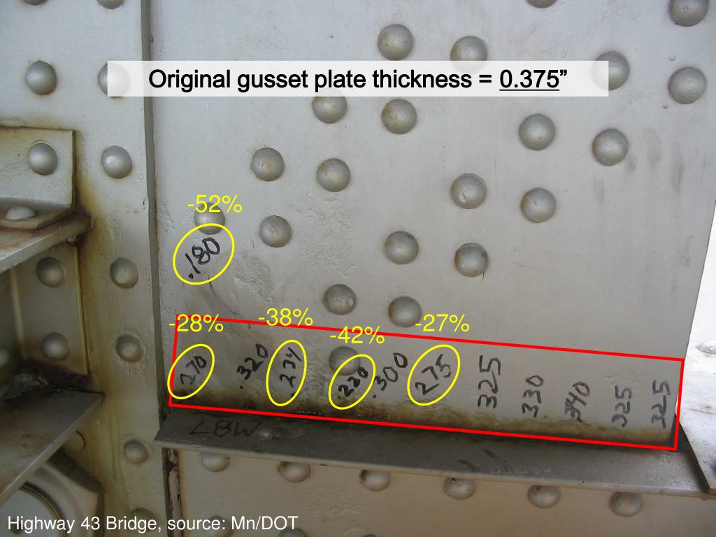 Original gusset plate thickness = 0.375” -52% -38% -28% -27% -42% Highway 43 Bridge, source: Mn/DOT