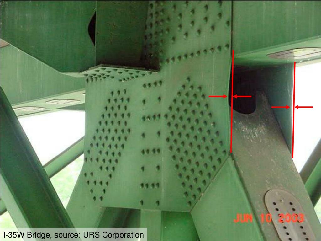 Gusset Plate Distortion • Gusset plate distortion found on DeSoto bridge in Saint Cloud, MN • Distortion believed to have occurred during original construction in 1957 • Distortion not discovered for 50 years • Discovered only with inspections that emphasized condition of gusset plates
