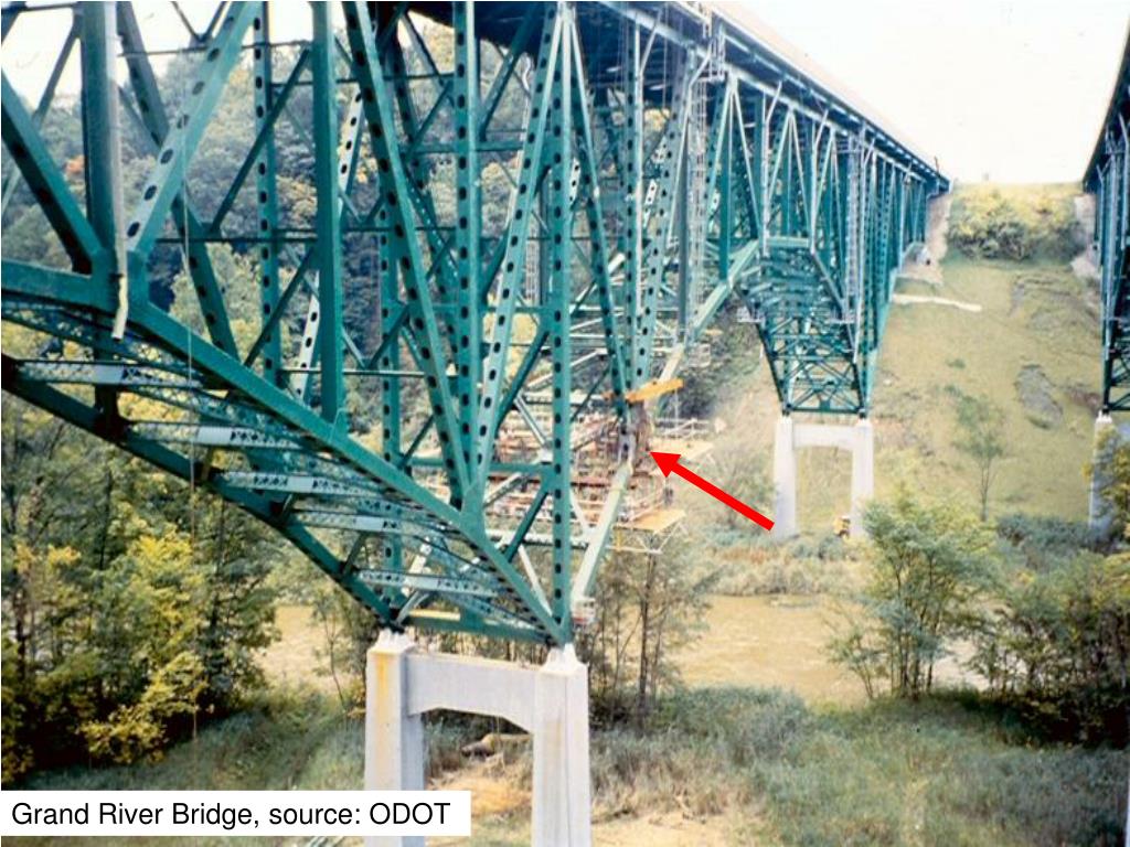 Corrosion on Ohio Bridges • Gusset plate failure of Grand River bridge in May 1996 • Right lane and shoulder closed to traffic for repainting project • Maintenance vehicles and equipment parked in closed traffic lane • Truck traversing bridge in open traffic lane caused buckling of several gusset plates below work zone