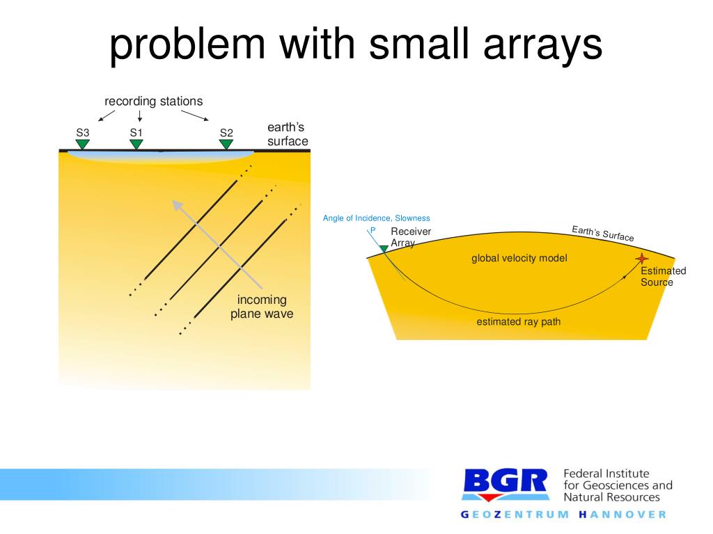 Arrays in Germany GERES: aperture ~4km frequencies: 1 - 50 Hz GRF: aperture ~100km frequencies: 0.1 – 5 Hz GRSN: aperture ~1000km frequencies: 0.01 – 0.5 Hz